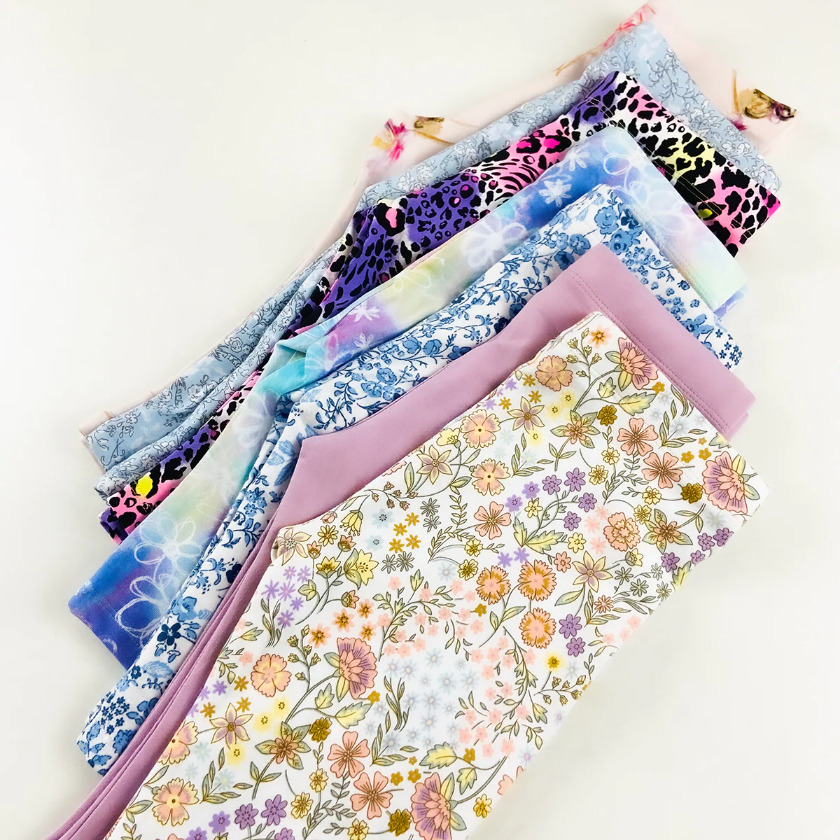 - Colourful mix: floral prints, pinks, blues—great for mixing and matching